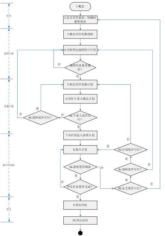 在实施阶段的最初就是计划,首先就是要确定项目的实施战略,战略的选择取决于对项目的定义。在技术性项目中,应用成熟技术可以降低风险,应用尖端技术尽管使风险增加,但可以得到竞争优势。