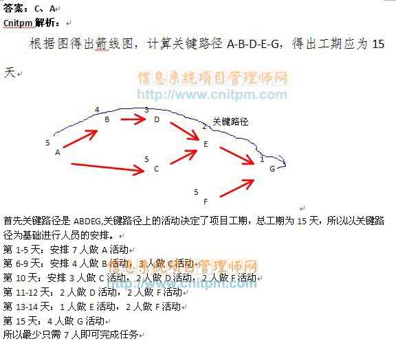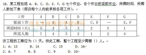 某工程包括A、B、C、D、E、F、G七个作业,各个作业的紧前作业、所需时间、所需人数如下表(假设每个人均能