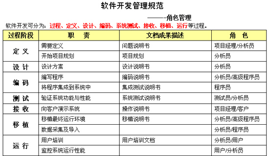 摘项目管理的根本目的是按时、保质、保量完成预期交付的成果。项目管理要让整个组织能清楚理解项目实施的目的、影响、进度,应做到项目组所有员工都应理解项目实施的原因、意义及客户的要求。在项目管理中还能看到公司高层领导通过实际行动表现出来的对于项目实施的支持与帮助,通过以制度化管理来组织合理安排员工的工作职责和角色转换。为满足上述要求,就必须让员工、企业、客户能接受并适应新的“软件项目开发管理规范”。