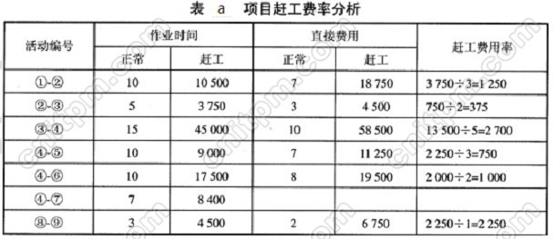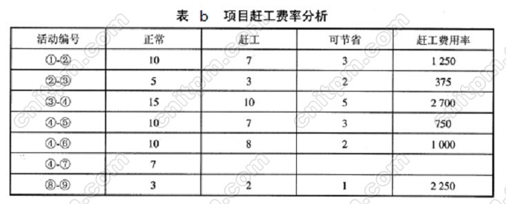 根据表(a)的信息,为保证项目完成,要求在关键路径上赶工3天,赶工费用率最低的是②-③,但②-③进行赶工2 天后,还差1 天。此时,可以在关键路径④-⑥上赶工1 天,使得④-⑥的完成时间变为9 天,但此时④-⑥的赶工导致④-⑤也必须赶工1 天。由此,计算出赶工的费用。本题容易产生错误的地方为:只考虑了④-⑥赶工的费率,而没有考虑④-⑤相应的变化。
