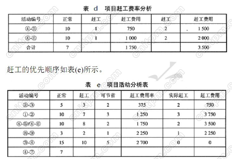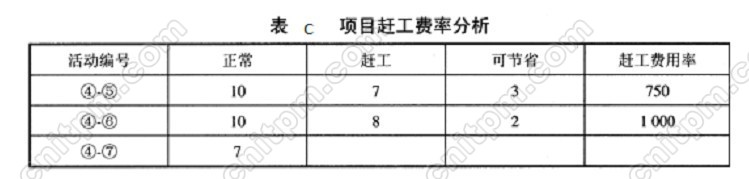 首先,我们列出并行的3 个任务④-⑤、④-⑥.、④-⑦的赶工费用率,如表(c)所示。