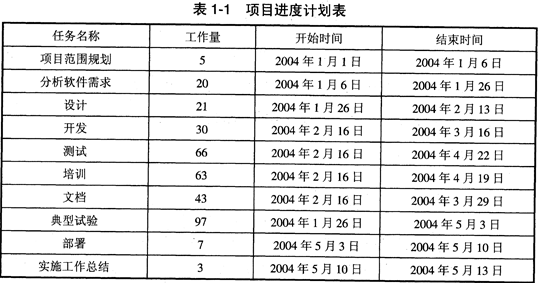 副总经理在接到任务后,即开始了项目的启动工作。项目经过前期的一些工作后,副总经理任命小丁为该项目的项目经理,小丁组建了项目团队,并根据项目前期的情况,开始进行项目的计划,表1一1所示为初步项目进度计划表。