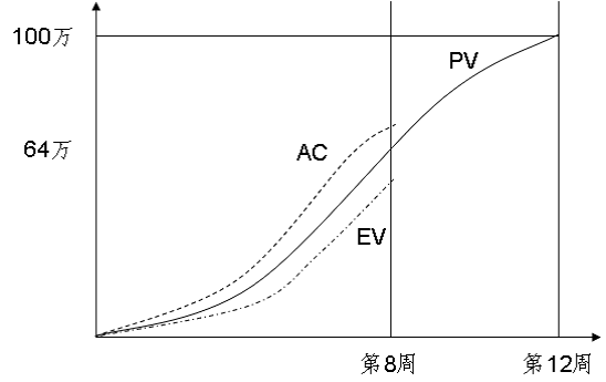一个预算 100 万的项目,为期 12 周,现在工作进行到第八周。已知成本预算是 64 万,实际成本支出是 68 万,挣值为 54 万。