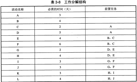 在与项目团队成员探讨后,假设已经确认了12项基本活动。所有这些活动的名称、完成每项活动所需的时间,以及与其他活动之间的约束关系如表3-8所示。