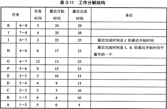 根据表3-10,得出完成任务的时间为29。根据网络图,从后往前推可以得到最迟开始时间和最迟完成时间,如表3一11所示。