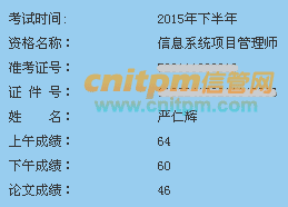 嘉宾介绍:2015年下半年JRS直播信息系统项目管理师优秀学员,信息系统项目管理师全国前50名---严仁辉,综合知识:64,案例分析:60,论文:46,总分170分。