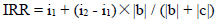 其中,IRR(Internal Rate of Return)表示内含报酬率, i1 表示有剩余净现值的低折现率,i2 表示产生负净值的高折现率,|b|表示为低折现率时的剩余净现值绝对值,|c|表示为高折现率时的负净现值绝对值。