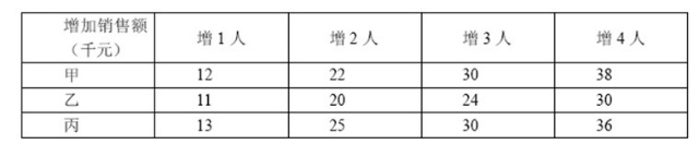公司准备将新招聘的4名销售员分配到下属3个销售点甲、乙和丙。各销售点增加若干名销售员后可增加的月销售额如下表: