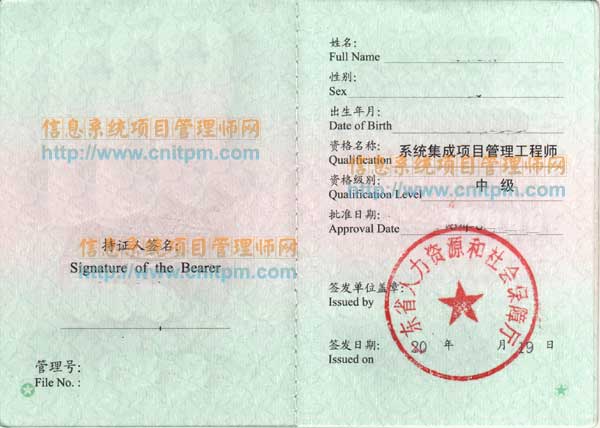 系统集成项目管理工程师证书样本仅供参考!因为每年可能会有细微的差异。系统集成项目管理工程师考试合格的考生将颁发由中华人民共和国人力资源和社会保障部、工业和信息化部用印的计算机技术与软件专业技术资格(水平)证书,证书不需要注册,长久有效!