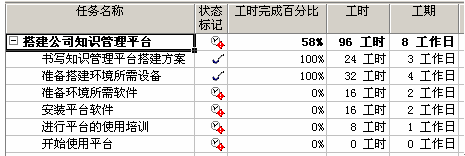 项目组成员可以在Project中对自己负责任务的完成情况进行设置,待设置被项目经理确认后,登录系统就可以查看项目各个任务的完成情况,如下图: