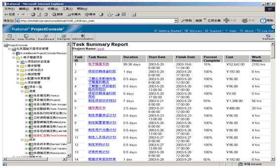 以上所介绍的业务功能:项目管理由MS Project、软件需求管理由IBM Rational RequisitePro、软件设计由IBM Rational Rose Data Modeler、软件变更管理由IBM Rational ClearQuest、软件版本控制由IBM Rational ClearCase、软件测试管理由IBM Rational TestManager分别完成的,对于项目管理者来说,应用起来有诸多不便,IBM提供的Rational ProjectConsole解决了以上问题,将这些软件有机地集合起来,极大地方便了用户。在Rational ProjectConsole里,将软件项目的管理分为:项目里程碑级和任务级两种管理。