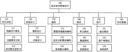 (3)项目工作结构分解(WBS)。WBS的作用是把安排与定义项目范围的各组成部分,按可交付成果进行组合。项目经理根据团队成员职责分工,把复杂的工作逐步分解成要素工作,使得项目成员的工作具体明确、易操作和易控制。通常软件项目采用基于可交付的成果为第一层次,具体的工作任务为第二层次,每下降一个层次意味着对项目可交付成果有更详尽的描述。遵循以目标体系为主导、以项目系统说明为依据,自上而下,由粗到细,如图1所示。