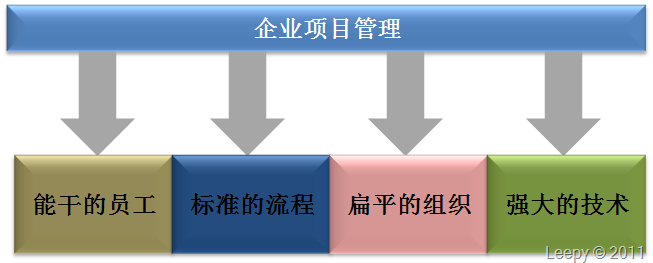 所谓企业项目管理,就是站在企业高层管理者角度对企业中各种各样的任务进行项目管理,其主导思想是将企业的运作当作或者参照项目来进行管理(management by project),这是一种以项目为中心的长期性组织管理方式,其核心是基于项目管理的组织管理体系。