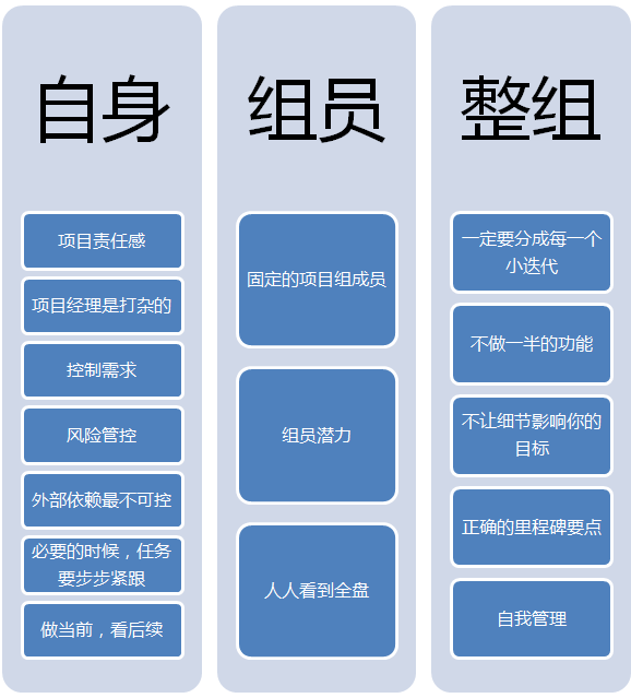 一个可以自我管理的项目组,才是一个稳定高效的项目组。项目经理才可以抽身出来,同时去做一些其他的对部门,对公司同时也对自己有利的事情。