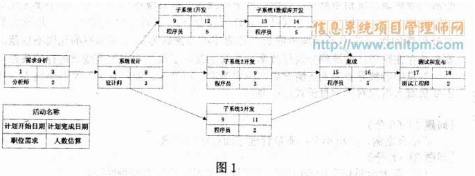 项目经理根据项目总体要求制定了某项目的网络资源计划图(图1所示,单位为日,为简化起见,不考虑节假日)并向公司申请了2名分析师负责需求分析,3名设计师负责系统设计,10名程序员负责子系统开发和集成,2名测试工程师负责系统测试和发布。项目经理估算总人力成本为27400元。