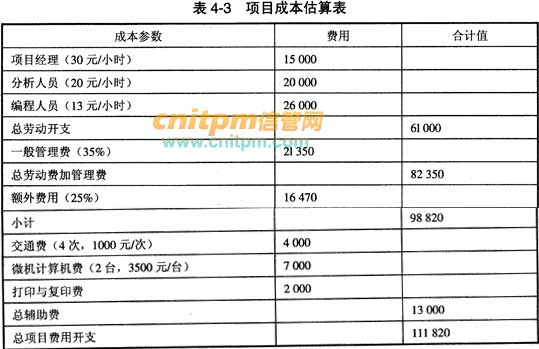 项目经理的成本是30元/小时,项目经理张工参与项目的时间是500小时,而分析人员的成本参数是20元/小时,2个分析人员,每人参与项目时间是500小时,编程人员的成本参数是13元/小时,2个编程人员,每人参与项目时间是1000小时,由于参数模型是简单的线性模型,所以,很方便计算出人力成本是61000元;其间接成本包括一般管理费和额外费用,一般管理费是人力成本的35%,额外费用是人力成本和管理成本的20%;这样合计为98820元;还有设备费用及其间接费用13000元,项目成本总计111820元,详见表4-3.