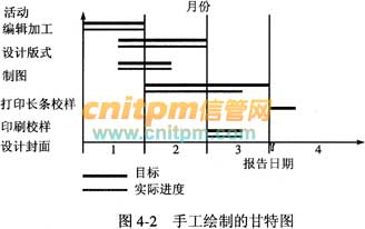 甘特图(Gantt chart)是在20世纪初由亨利·甘特开发的。它基本上是一种线条图,横轴表示时间,纵轴表示要安排的活动,线条表示在整个期间上计划的和实际的活动完成情况。甘特图直观地表明任务计划在什么时候进行,以及实际进展与计划要求的对比。图4-2是一个手工绘制的图书出版项目甘特图。
