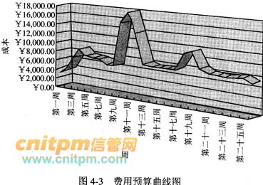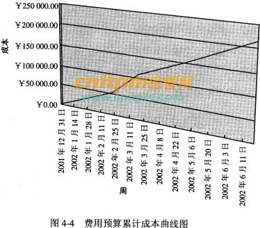 时间以月为单位表示在图的下方,主要活动从上到下列在图的左边。计划需要确定书的出版包括哪些活动,这些活动的顺序,以及每项活动持续的时间。时间框里的线条表示计划的活动顺序,空白的现况表示活动的实际进度。甘特图作为一种控制工具,帮助管理者发现实际进度偏离计划的情况。在本案例中,除了打印长条校样以外,其他活动都是按计划完成的。在费用预算方面,如按时间坐标来分析,有两种表现方式:一是费用预算曲线图,二是费用预算累计曲线图。图4-3和图4-4为Project 2000绘制的费用预算曲线图和费用预算累计成本曲线图。