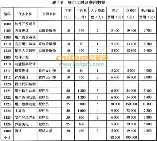 项目正式立项后,李工制定了一份初步的项目成本计划。李工估计出了每项工作的工期及所需要的工作量,如表4-4所示。此外,表4-4也给出了每项工作除人力资源费用外的其他固定费用(如硬件设备和网络设备等)。