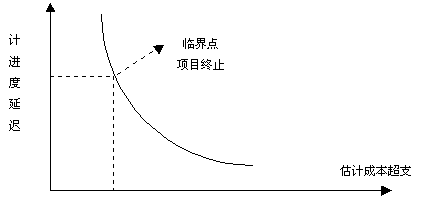 一种对风险评估的常用技术是定义风险的参照水准,对绝大多数软件项目来讲,风险因素——成本、性能、支持和进度就是典型的风险参照系。也就是说对成本超支、性能下降、支持困难、进度延迟都有一个导致项目终止的水平值。如果风险的组合所产生的问题超出了一个或多个参照水平值时,就终止该项目的工作,在项目分析中,风险水平参考值是由一系列的点构成的,每一个单独的点常称为参照点或临界点。如果某风险落在临界点上,可以利用性能分析、成本分析、质量分析等来判断该项目是否继续工作。图2 表示了这种情况。