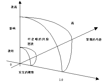 一旦完成了风险表的内容,就可以根据概率及影响来进行综合考虑,风险影响和出现概率从风险管理的角度来看,它们各自起着不同的作用(见图1)。一个具有高影响但低概率的风险因素不应当占用太多的风险管理时间 ,ā而具有中到高概率、高影响的风险和具有高概率及低影响的风险,就应该进行风险分析。