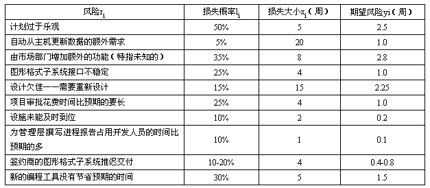 表1是风险分析表的一个例子,可以建立一个用风险、损失概率、损失大小和期望风险这样的风险评估表。
