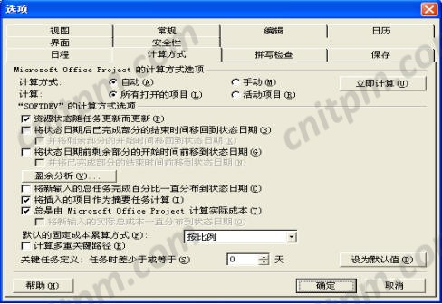 3、 在“默认的任务盈余分析方法”选择框中选择Project计算BCWP时所采用的计算方法。