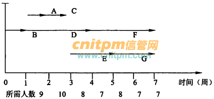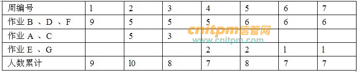 在不推迟工期的情况下,关键路径上的作业B,D,F在上述甘特图上的位置就已经确定了。作业B 应安排在第1 周,横坐标为(0,l) ;作业D 应安排在第2,3,4周,横坐标为(1, 4) :作业F 应安排在第5, 6, 7周,横坐标为(4,7)。非关键作业A 和C 必须依次在作业F 之前安排,即在横坐标(O,4)中安排;作业E 和G 必须依次在作业B 之后安排,即在横坐标(1,7)中安排。由于作业B需要9人,整个工程所需的人数不会低于9人。