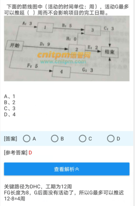 那G 只要在12周完成就不会影响项目工期,那G 可以延期的时间是12-8=4