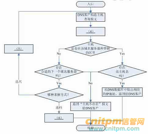 下图是采用dns将主机名解析成一个ip地址过程的流程图。请选择恰当的内容填写在(4)、(5)、(6)空白处。