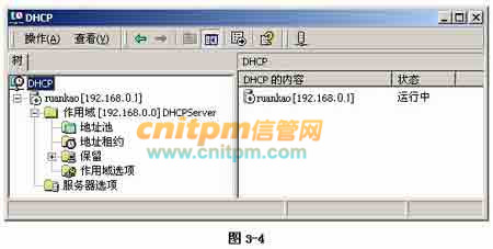 在dhcp服务器安装完成后,dhcp控制台如图3-4所示。