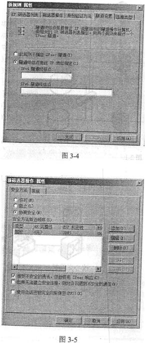 IPSec隧道由两个规则组成,每个规则指定一个隧道终结点。为从主机A到主机B的隧道配置隧道规则时,图3-4中所示的“IPv4隧道终结点”应该填写的IP地址为(9)。 在配置新筛选器时,如果设置不允许与未受到IPSec保护的计算机进行通信,则图3-5“安全方法”配置窗口所示的配置中需要做出的修改是(10)。