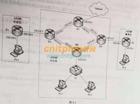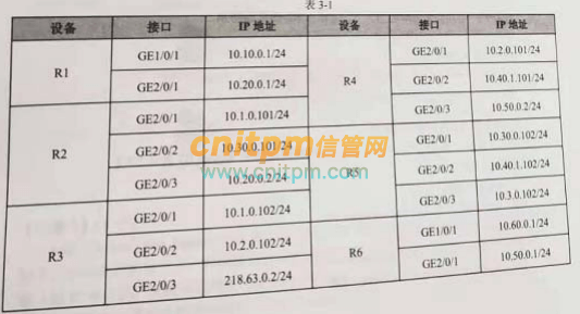 办公区自制系统编号100、生活区自制系统编号200、教学区自制系统编号300.路由器接口地址信息如表3-1所示。