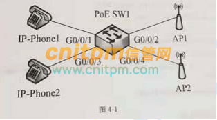 某公司在网络环境中部署多台IP电话和无线AP,计划使用PoE设备为IP电话和无线AP供电,拓扑结构如图4-1所示。