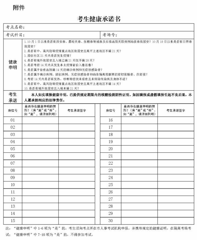 八、考试期间,监考人员将组织全体考生签订《考生健康承诺书》(考点提供,样式见附件),请考生提前了解健康承诺书内容,按要求如实签订。