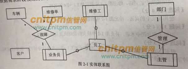 根据问题描述,补充3个联系,完善图2-1的实体联系图。联系名可用联系1、联系2和联系3代替,联系的类型为1:1、1:n和m:n(或1:1、1:*和*.*)。
