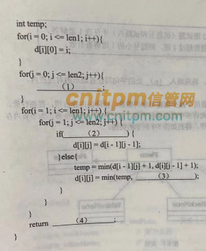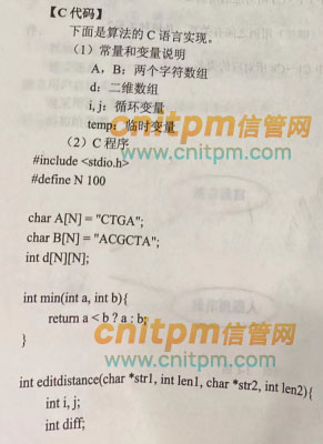 根据说明和C代码,算法采用了(5)设计策略,时间复杂度为(6)(用0符号表示,两个字符串的长度分别用m和n表示)。