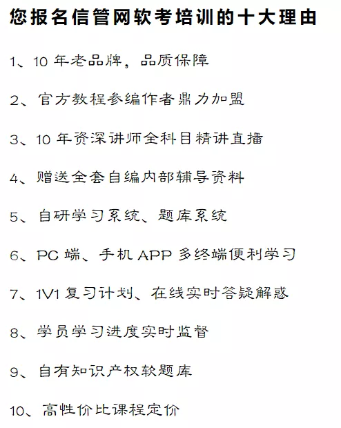 市场上有很多软考相关的培训机构,特别是在如今大数据时代,只要你经常关注软考相关信息,那么你必定会接收到各种各样的相关广告,这需要你有信息识别的能力,无论选择哪家培训机构,我们都要注意它是否靠谱。