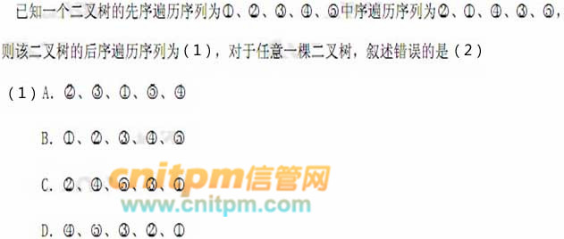 D、由其层序遍历序列和中序遍历序列不能构造该二叉树的后序遍历序列