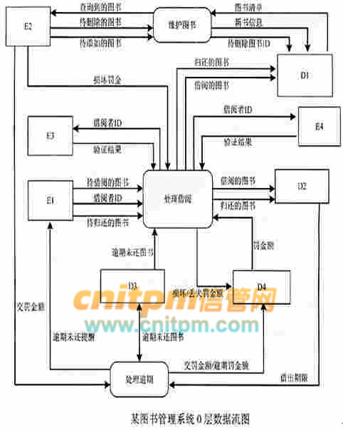 现采用结构化方法对该图书管理系统进行分析与设计,获得如图2-9所示的顶层数据流图和图2-10所示的0层数据流图。