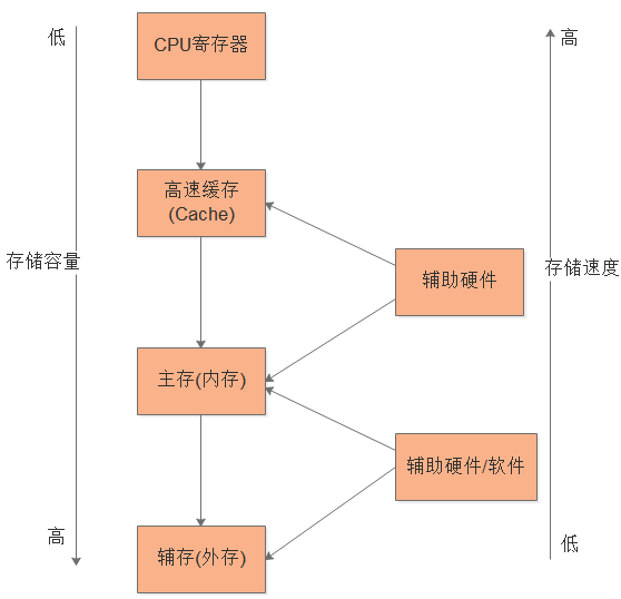 CPU内部通用存储器—Cache—主存储器—联机磁盘存储器—脱机光盘、硬盘存储器