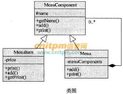 现在采用组合(Composition)模式来构造该饭店的菜单,使得饭店可以方便地在其中增加新的餐饮形式,得到如图6-2所示的类图。其中MenuComponent为抽象类,定义了添加(add)新菜单和打印饭店所有菜单信息(print)的方法接口。类Menu表示饭店提供的每种餐饮形式的菜单,如煎饼屋菜单、咖啡屋菜单等。每种菜单中都可以添加子菜单,例如图6-1中的甜点菜单。类MenuItem表示菜单中的菜式。