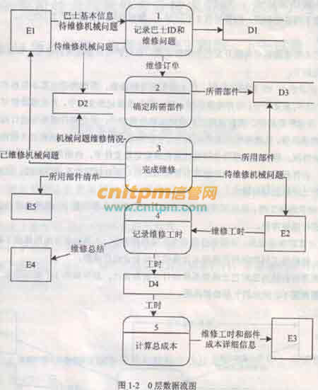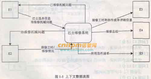 现采用结构化方法对巴士维修系统进行分折与设计,获得如图1-1所示的上下文数据流图和图1-2所示的0层数据流图。