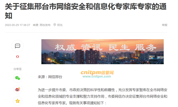 近日,小编在网上看到一则消息,来源于“邢台发布”的《关于征集邢台市网络安全和信息化专家库专家的通知》,这一看就知道对于拥有信息系统项目管理师证书的考生们来说是个好消息!申请评标专家,进入省级信息化评标专家库不仅是机遇,更是荣誉!