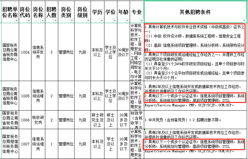 以下截图来源于云南税务局官网《国家税务总局云南省税务局2022年事业单位公开招聘工作人员公告》,该公告中很多岗位都要求具有软件设计师证书。