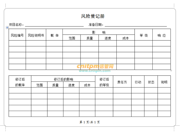 风险登记册是记录已识别单个项目风险的详细信息。包括识别到的所有风险,以及对这些风险的分类,对风险的优先级排序,对风险的一些应对措施等。