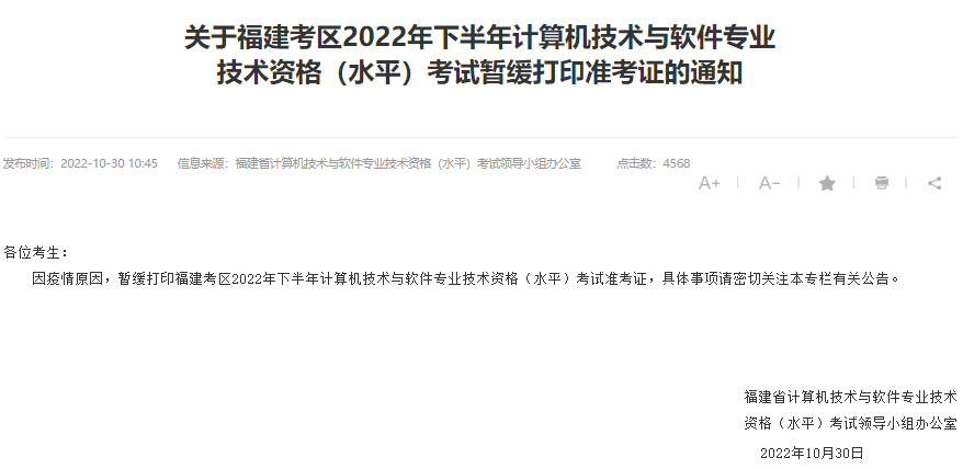关于福建考区2022年下半年计算机技术与软件专业技术资格(水平)考试暂缓打印准考证的通知