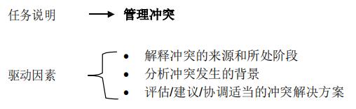 管理冲突 · 解释冲突的来源和所处阶段 · 分析冲突发生的背景 · 评估/建议/协调适当的冲突 |