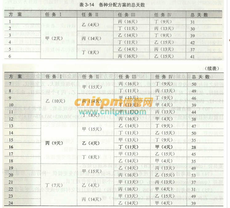 由表3-14可知,总天数最少的任务分配方案是:指派甲完成任务Ⅳ,乙完成任务Ⅱ丙完成任务Ⅰ,丁完成任务Ⅲ,此时,该项目的总工期为28天。