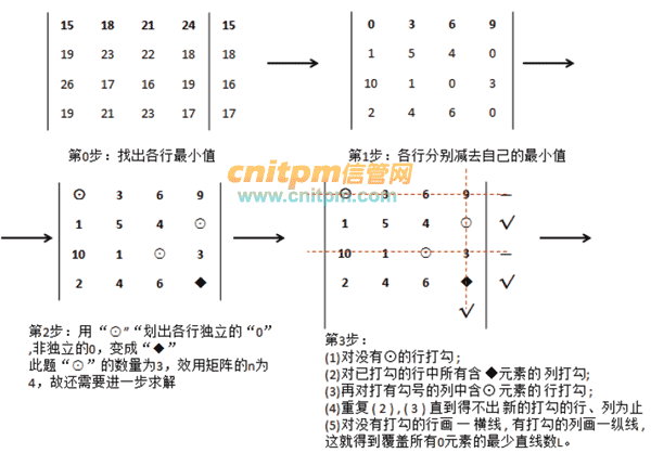 (1)行变换,找出每一行(每一列)的最小值,然后让每一行(每一列)都减去这个数